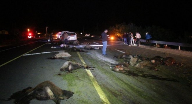 Sağlam’ın toplam 200 koyunu bulunduğu 45’inin iki gün önce kamyon çarpması sonucu telef olduğu, bu gün de otomobillerin çarpması sonucu 40 koyunun telef olduğu belirtildi.