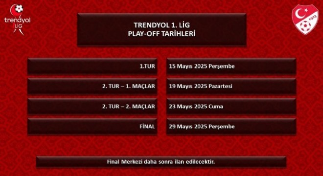 Türkiye Futbol Federasyonu'nun (TFF) resmi internet sitesinden açıklanan 2024-2025 sezonu play-off müsabaka tarihleri şöyle: