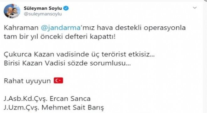 İçişleri Bakanı Soylu, sosyal paylaşım sitesi Twitter'deki hesabından yaptığı paylaşımda, "Kahraman jandarmamız hava destekli operasyonla tam bir yıl önceki defteri kapattı. Çukurca Kazan vadisinde üç terörist etkisiz. Birisi Kazan vadisi sözde sorumlusu. Rahat uyuyun J.Asb.Kd.Çvş. Ercan Sanca, J.Uzm.Çvş. Mehmet Sait Barış" ifadelerini kullandı.