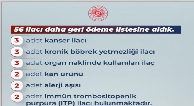 Bakan Işıkhan, sosyal medya hesabından yaptığı paylaşımda, "Sosyal Güvenlik Kurumumuzun düzenlemesi kapsamında 43’ü yerli üretim olmak üzere 56 ilacı daha geri ödeme listesine aldık. İlaçların arasında 3 adet kanser ilacı, 3 adet kronik böbrek yetmezliği ilacı, 3 adet organ naklinde kullanılan ilaç, 2 adet kan ürünü, 2 adet alerji aşısı, 2 adet immün trombositopenik purpura (ITP) ilacı bulunmaktadır. İlaçların hastalarımıza şifa olmasını temenni eder, vatandaşlarımıza sağlıklı bir ömür dilerim" ifadelerine yer verdi.