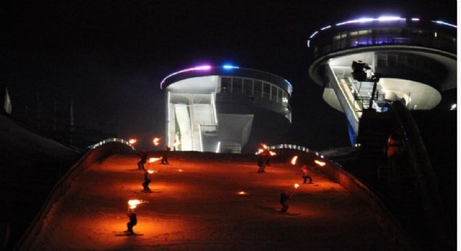 Anadolu Yıldızlar Ligi Türkiye Kayak Şampiyonası için Atlama Kuleleri'nde gerçekleşen resmi açılışta İstiklal Marşının ardından yapılan meşaleli kayak ve havai fişek gösterisi nefes kesti.