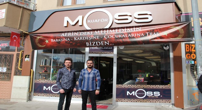 İş yerinde bulunan pankart üzerinde “ Afrin’deki Mehmedimin babasına, kardeşine, çocuklarına tıraş bizden” yazdıran Tolga Gürbüz ve Ferit Teper ellerinden geldiği kadar destek olmak istediklerini onların yalnız bırakmayacaklarını vurguladılar.