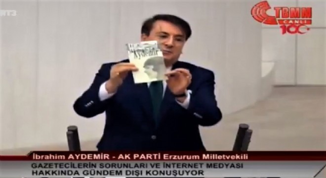 Milletvekili Aydemir, ‘Bakın, elimde bir kitap var. Bendeniz de, burada birkaç arkadaşım var, onlar da biliyorum ki soy ismini bu kitaptan almış, bu kitaba mevzu olan bir kahramandan almış insanlarız. Binlerce, on binlerce insan var bu soy ismi tebcil eden, yücelten. Niye? Muhayyel bir kahramanı o derece içselleştirmişiz ki neredeyse ailenin birer ferdi gibi kabul görmüş. Benim büyüklerim öyle anlatırlardı ki “Bizim büyük bir kahramanımızın soy ismidir.“ diye. Kim yazmış bunu arkadaşlar? Bir hanım muharrir Müfide Ferit Tek hanımefendi yazmış. Şimdi “gazeteci” diye tarif ediyoruz ya da “medyacı; anchorman” envaitürden isimler aldı dolayısıyla da değer kaybetti. Bu muharrir öylesine bir ismi kayda geçiyor ki Millî Mücadele’de özel bir anlam ifade ediyor, cepheye bu isimden dolayı, “Aydemir”den dolayı koşan binler, on binler oluyor. Öyleyse ‘muharrir’ bu derece önemli, bu derece kıymetli; onun bugünkü izdüşümü gazeteciler de böyledir. Ancak “gazetecilik” kavramını kullanan, onu asla ve kata hak etmeyen ve dahası, teröre teşne, terörü teşvik eden, sırf terörü teşvik edebilmek için o kimliği kullanan çok sayıda insan var ve burada çoğu zaman tartışma mevzu oluyor ki: “Gazeteciler cezaevinde, gazeteciler yargılanıyor.” şeklinde şikâyetler geliyor. Çok net söylüyorum burada, çok yakın takip ettim, uzun yıllarını bu mesleğe vermiş birisi olarak takip ettim; tamamı gazetecilik faaliyetinin dışında yargılanmış, sorgulanmış isimler. Niye bu böyle? Çünkü ara yerde bir büyük boşluk var, bu boşluğun mutlaka giderilmesi lazım. 1938 yılında bir kanun çıkıyor “Basında Meslek Birliği” diye, sekiz yıllık bir yürürlük sürecinden sonra kalkıyor. Öyleyse, yeniden bunun mutlaka konuşulması lazım, şu yüce çatı altında milletvekili arkadaşlarımızın yeniden gündeme getirmesi lazım. ‘ dedi.