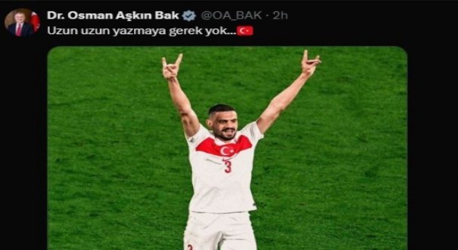 Gençlik ve Spor Bakanı Dr. Osman Aşkın Bak, UEFA'nın hakkında disiplin soruşturması açtığı milli futbolcu Merih Demiral'a sosyal medya hesabından destek paylaşımı yaptı.