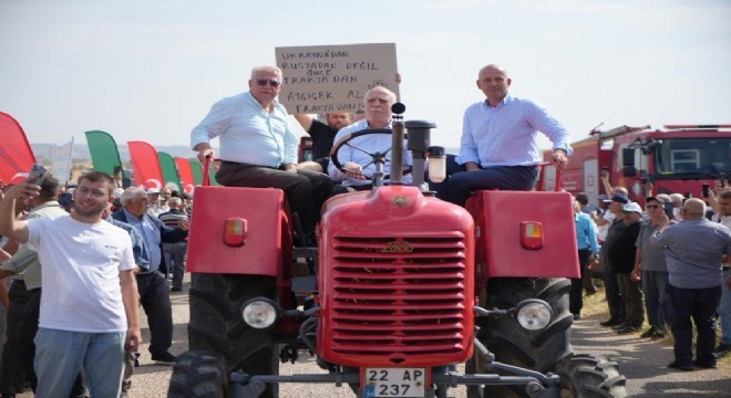 Edirne'nin Büyükdöllük köyünde ayçiçeği tarla gününe katılan TZOB Genel Başkanı Şemsi Bayraktar, tarlaya traktörle geldi. Bölge çiftçisinin de traktörleriyle konvoy oluşturarak geldikleri tarlada açıklama yapan Bayraktar, bölgede yaşanan kuraklığa dikkat çekti.