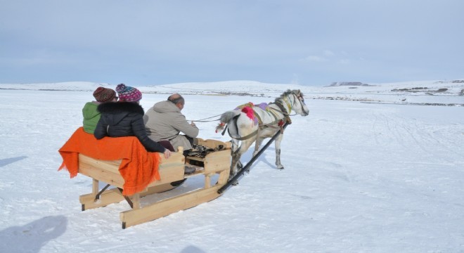 Yaklaşık 30 santim buz tutan ve üzeri karla kaplı Çıldır Gölü’nde Kars’a dışarıdan gelen vatandaşlar, atlı kızaklara binerek göl üzerinde kızak yapma keyfi doyasıya yaşıyor.