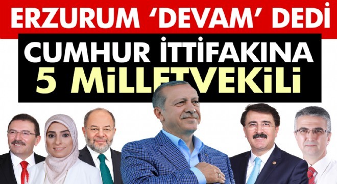 24 Haziran seçimlerinin kesin olmayan sonuçlarına göre AK Parti 4, MHP 1, İYİPARTİ de 1 milletvekili çıkardı. AK Parti’den Recep Akdağ, Zehra Taşkesenlioğlu, Selami Altınok ve İbrahim Aydemir 27’inci dönem Erzurum Milletvekili seçildiler