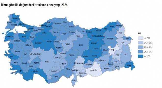 İlk doğumdaki ortalama anne yaşı illere göre incelendiğinde, 2024 yılında ilk doğumda ortalama anne yaşının en yüksek olduğu il 29,4 ile Tunceli oldu. Bu ili 29,0 yaş ile Artvin, 28,8 yaş ile İstanbul izledi.