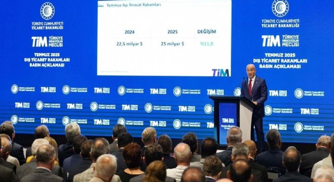 Türkiye, temmuzda 25 milyar dolarla en yüksek aylık ihracat değerine ulaştı. 2025'in Ocak-Temmuz döneminde yedi aylık ihracat 156 milyar dolara, son 12 aylık ihracat ise 269,5 milyar dolara yükseldi.