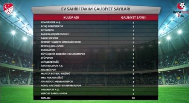 Spor Toto 1’inci Ligde şampiyonluğun en güçlü adaylarından olan Erzurumspor ligde iç sahada en fazla sayıda maç kazanan ekip oldu. Evinde oynadığı 10 maçın 9’unu kazanan Erzurumspor’u iç saha galibiyet sayısı yüksekliği kaydında 6 galibiyetle Altınordu, Ümraniyespor, İstanbulspor, Kocaelispor ve MKE Ankaragücü takip etti.