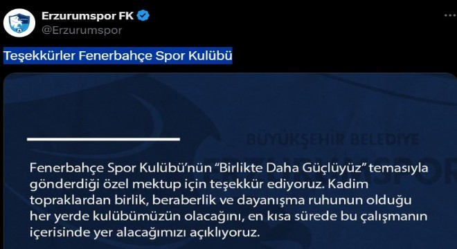 Erzurumspor Kulübü yayımladığı mesajla ‘Birlikte Daha Güçlüyüz’ temalı Fenerbahçe desteğine teşekkür etti.