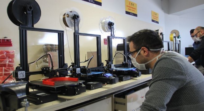 Sağlık çalışanları için evlerindeki 3 boyutlu yazıcısıyla siperli maske üretmeye başlayan akademisyen ve öğrenciler üniversitede kurulan üretim merkezinde günlük 120 siperli maske üretiyor.