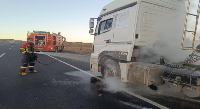 Olay, Genç ilçesi çıkışında meydana geldi. Edinilen bilgilere göre, 47 DL 525 plakalı tırın balatalarının tutuşması sonucu araçta yangın çıktı. Alevleri fark eden sürücünün durumu bildirmesi üzerine bölgeye itfaiye ekipleri sevk edildi.