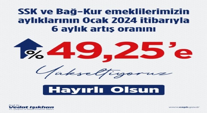 Çalışma ve Sosyal Güvenlik Bakanı Vedat Işıkhan, “SSK ve Bağ-Kur emeklilerimizin emekli aylıklarındaki artışı ocak ayı itibarıyla yüzde 49,25’e yükseltiyoruz. Böylece tüm emeklilerimizin aynı oranda artış almasını sağlamış olduk” dedi.