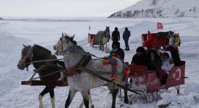 Doğu Anadolu Bölgesi'nin ikinci büyük gölü olan Çıldır Gölü'nün 2021'in Aralık ayında buz tutan yüzeyi, soğukların devam etmesi nedeniyle hala çözülmedi. Yaklaşık 35 santimetre buz kalınlığı bulunan gölde, atlı kızakla gezinti yapan yerli ve yabancı turistler, fotoğraf çekerek günün keyfini çıkardı.