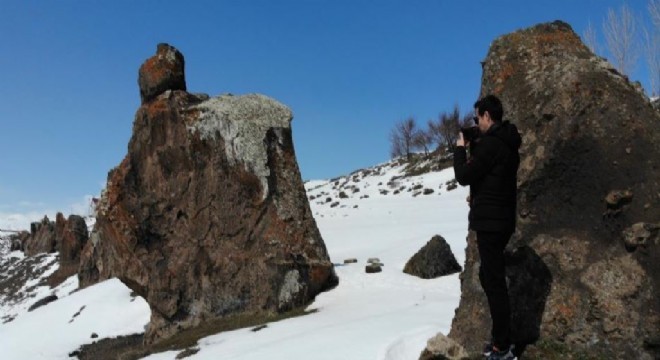 Bitlis’in Tatvan ilçesinde bulunan ve Nemrut'un Develeri olarak adlandırılan dikili taş bloklar, kar yağışının ardından görsel şölen oluşturdu.