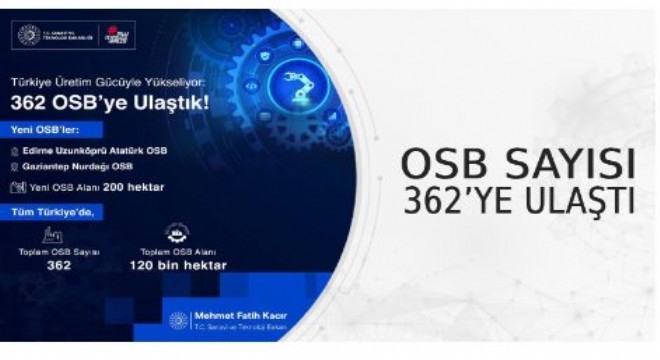 Sanayi ve Teknoloji Bakanı Mehmet Fatih Kacır, “Edirne Uzunköprü Atatürk OSB ve Gaziantep Nurdağı OSB ile organize sanayi bölgelerimizin sayısını 362’ye çıkardık. 120 bin hektarlık alanda, 362 OSB ile üretim altyapımızı sağlamlaştırdık.” dedi.