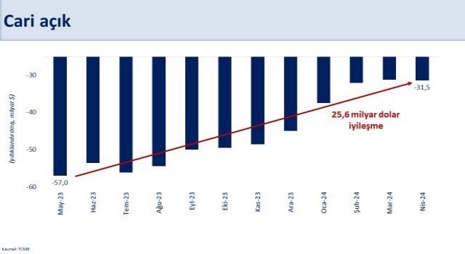 Bakan Şimşek, yılın kalanında cari açığın 24-27 milyar dolar aralığında seyretmesini ve yıl sonunda OVP tahmini olan 34,7 milyar doların altında gerçekleşeceğini öngörüldüğü bilgisini verdi.