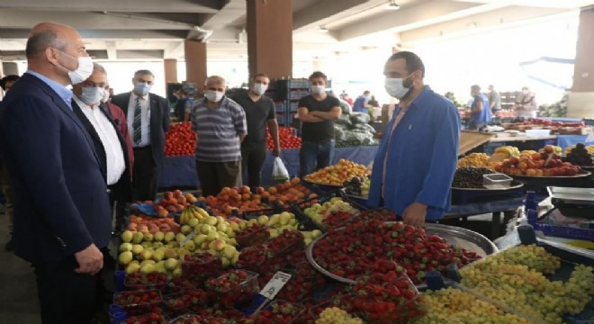 İçişleri Bakanı Süleyman Soylu, “sağlık için, hepimiz için” başlığıyla Türkiye genelinde geniş çaplı olarak gerçekleştirilen korona virüs denetimlerine katıldı. Denetimler kapsamında Ankara’nın Mamak ilçesinde bulunan bir kapalı pazar yerine giden Bakan Soylu’ya, Mamak Belediye Başkanı Murat Köse, Türkiye Esnaf ve Sanatkarlar Konfederasyonu Başkanı Bendevi Palandöken ve Ankara İl Emniyet Müdürü Servet Yılmaz eşlik etti. Kapalı Pazar yerini baştan sona gezerek esnaflarla bir bir konuşan Bakan Soylu, pazarcı esnafına ve alışveriş yapan vatandaşlara maske, mesafe ve temizlik kurallarına uymaları yönünde uyarılarda bulundu.