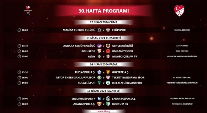 Türkiye Futbol Federasyonu, Trendyol 1. Lig'in 30 ve 31. haftasının müsabaka programını duyurdu. TFF'nin resmi internet sitesinden yapılan açıklamaya göre, 1. Lig'de 30 ve 31. haftanın programı şu şekilde: