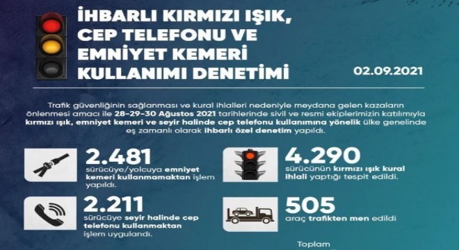 Emniyet Genel Müdürlüğü, trafikte güvenliğin sağlanması ve kural ihlallerinden ötürü meydana gelebilecek olumsuz durumların önlenmesi amacıyla 28-30 Ağustos tarihleri arasında ülke genelinde eş zamanlı “ihbarlı özel denetim” gerçekleştirildiğini duyurdu. Toplamda 13 bin 606 kural ihlalinin tespit edildiği denetimlerde; 2 bin 481 sürücüye ve yolcuya emniyet kemeri takmamaktan, 2 bin 211 sürücüye ise seyir halindeyken cep telefonu kullanmaktan dolayı işlem yapıldığı belirtildi. 4 bin 290 sürücünün kırmızı ışıktan geçtiği belirlenen denetimlerde 505 araç trafikten men edilirken, 54 sürücünün belgesi de geçici olarak geri alındı.