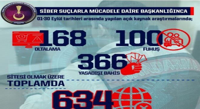 Jandarma Genel Komutanlığı'nın resmi sosyal medya hesabı üzerinden yapılan paylaşımda, Siber Suçlarla Mücadele Daire Başkanlığı tarafından 01-30 Eylül 2020 tarihleri arasında yapılan açık kaynak araştırmalarında; 168 oltalama, 100 fuhuş ve 366 yasa dışı bahis sitesi olmak üzere toplam 634 sitenin erişiminin engellendiği duyuruldu.