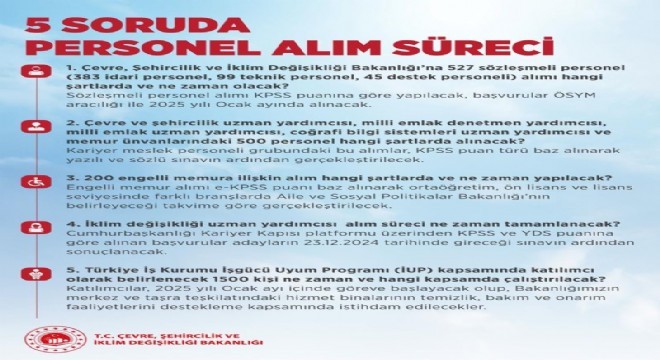 İklim değişikliği uzman yardımcısı alımı için Cumhurbaşkanlığı Kariyer Kapısı platformu üzerinden KPSS ve YDS puanına göre başvuruların yapılacağı, adayların 23 Aralık'ta gireceği sınavın ardından alınacak kişilerin belirleneceği ifade edildi. İŞKUR İşgücü Uyum Programı (İUP) kapsamında alınacak bin 500 kişinin 2025 yılı Ocak ayında göreve başlayacağı, Bakanlığın merkez ve taşra teşkilatındaki hizmet binalarının temizlik, bakım ve onarım faaliyetlerini destekleme kapsamında istihdam edileceği belirtildi.