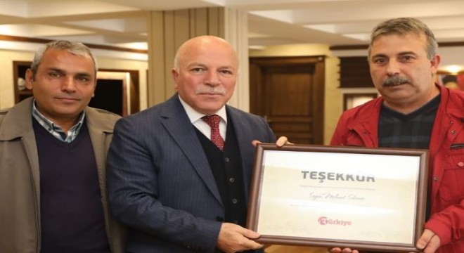 Türkiye Gazetesi Erzurum Bölge Sorumlusu Orhan Yılmaz Küçükdemir, Büyükşehir Belediye Başkanı Mehmet Sekmen’i makamında ziyaret etti. Başkan Sekmen’e “Teşekkür Belgesi” takdim eden Orhan Yılmaz Küçükdemir, “Başkanımıza önümüzdeki dönemde de başarılar diliyoruz. Erzurum’da belediyecilik anlamında çok güzel hizmetlere imza atan Başkanımıza çalışmalarından dolayı teşekkürlerimizi sunuyoruz” dedi.