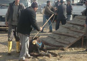 Erzurum hayvan pazarında başına aldığı sopa darbeleri nedeniyle yere yığılan kurbanlık dana, sürüklene sürüklene kamyon kasasına bindirildi.