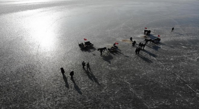 Kars'ta Çıldır Gölü'ne gelen ziyaretçiler, buz üzerinde atlı kızaklarla kayıp sevdikleriyle gönüllerince eğleniyor.