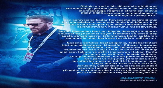 Dal mesajında şunları kaydetti; ‘Oldukça zor bir dönemde aldığımız sorumluluğu yerine getirmenin ve her türlü olumsuzluğa rağmen alnımızın akıyla 2022 – 2023 sezonunu tamamlamanın mutluluğunu yaşıyoruz. Son saniyesine kadar heyecanla geçirdiğimiz bu mücadelenin sonunda ligde kaldığımız için ve kalbi Erzurumspor için atan taraftarlarımızı sevindirmenin huzurunu hissediyoruz. Sezon başından beri desteğini aldığımız onursal başkanımız Sayın Mehmet Sekmen bey başta olmak üzere takımımıza katkı sağlayan yanımızda olan herkese teşekkür ediyorum