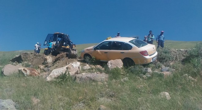 Horasan’a bağlı Danişment köyünde yoldan çıkan ticari taksi, şarampolde asılı kaldı.