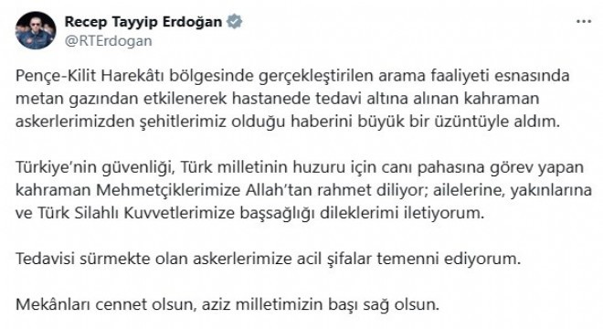 Cumhurbaşkanı Recep Tayyip Erdoğan, Pençe-Kilit Harekatı bölgesinde metan gazından etkilenerek şehit olan 5 asker için taziye mesajı yayımladı. Cumhurbaşkanı Erdoğan mesajında, "Pençe-Kilit Harekâtı bölgesinde gerçekleştirilen arama faaliyeti esnasında metan gazından etkilenerek hastanede tedavi altına alınan kahraman askerlerimizden şehitlerimiz olduğu haberini büyük bir üzüntüyle aldım. Türkiye’nin güvenliği, Türk milletinin huzuru için canı pahasına görev yapan kahraman Mehmetçiklerimize Allah’tan rahmet diliyor; ailelerine, yakınlarına ve Türk Silahlı Kuvvetlerimize başsağlığı dileklerimi iletiyorum. Tedavisi sürmekte olan askerlerimize acil şifalar temenni ediyorum. Mekanları cennet olsun, aziz milletimizin başı sağ olsun" dedi.