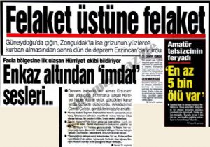 Dün akşam saat 19.20'de meydana gelen ve 30 saniye süren 6.3 şiddetindeki deprem, Erzincan'da büyük hasara yol açtı. Konutların 3'te ikisi yıkıldı ya da hasar gördü. Binlerce kişi enkaz altında kaldı. (14 Mart 1992 Hürriyet'te yayınlanmıştır)