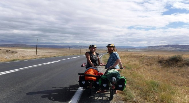 Almanya’dan başlayıp bisikletle dünya turuna çıkan Alman biyolog çift, 3 bin 500 kilometre yol kat ettikten sonra Erzurum’da mola verdi. Elis ve Lukas isimli çift, Erzurum’da bir vatandaşın yoğun sevgi gösterisiyle karşılaştı.