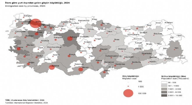 Türkiye'ye 2024 yılında göç edenlerin illere göre dağılımı incelendiğinde, yüzde32,8 ile en fazla göç alan ilin İstanbul olduğu görüldü. İstanbul'u yüzde8,5 ile Antalya, yüzde7,4 ile Ankara, yüzde5,5 ile Mersin ve yüzde3,7 ile İzmir takip etti.