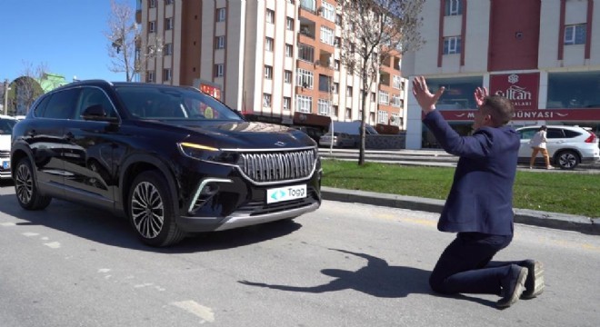 Erzurum’da şehir turu atan Togg vatandaşlardan yoğun ilgi gördü. Togg’un önüne diz çöken bir vatandaş, daha sonra arabayı öperek “Şükürler olsun. Tam 100 yıl oldu” diyerek dua etti.