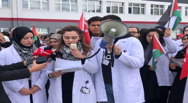 Basın açıklamasını okuyan Radyoloji Bölümü Araştırma Görevlisi Melek Sevda Ateş, “Aynı gökyüzünün altında nefes alan, dünyanın dört bir yanındaki vicdan sahibi insanlar; ortak bir amaç uğruna zulme karşı seslerini yükseltiyor ve Gazze’deki katliama karşı tepkilerini ortaya koyuyorlar. Bugün burada, insan olmak ve insan olarak kalabilmek için, kısacası insanlık adına bir araya geldik ve birbirimizle el ele verdik. Ruh dünyamızı felç eden, hepimizin gözleri önünde yaşanan bu barbarlığın muhatabı olan masum Gazze Halkı’nın bizi vicdana çağıran çığlıklarını duyurmak için buradayız. Ne yazık ki Siyonist İsrail hükümetinin Gazze’deki katliamları yeni değil, tam 75 yıldır devam etmektedir. İşgalci İsrail Hükümeti 7 Ekim’den beri, 'kendini savunma' propagandası aldı altında Gazze’de her türlü savaş suçunu işlemekte ve bir soykırım gerçekleştirmektedir. Bugün bu soykırımın 49. günündeyiz; son verilere göre tam 14 bin 128 savunmasız sivil öldürülmüştür, ölenlerin 5 binini çocuklar oluşturmaktadır. 20 Kasım Dünya Çocuk Hakları Günü’nde Gazze’deki binlerce masum çocuğun, en temel hakkı olan yaşama hakkı ellerinden alınmıştır; 20 Kasım artık dünya utanç günüdür. UNICEF’in verilerine göre 800 binden fazla çocuk ve 1 milyon 700 bin Gazzeli vatanlarından tehcir edilmiştir. Saldırılar neticesinde, cenazeleri sokakta veya enkaz altında kalan 4 bin 500’ü kadın ve çocuk olmak üzere 6 bin 800 kişi kayıptır” dedi.
