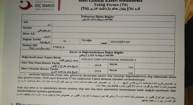 Konuyla ilgili yapılan açıklamada; “Son zamanlarda sayıları aşırı derecede artan ve ülkemize kaçak yollarla giren göçmen şahıslarla ilgili yapılan çalışmalarda; Afganistan/Pakistan vb. ülkelerden kaçak yollarla ülkemize giren göçmen şahıslara, bulundukları illerde yasal olarak ikamet etme imkânı taşıyan, İl Göç İdaresi İdari Gözetim Kararı Sonlandırma Tebliğ Formlarını sahte olarak düzenleyip, büyük meblağlar karşılığında sattıkları tespit edilen Pakistan uyruklu A.A. isimli şahıs ile Afganistan uyrukla A.J.N isimli şahıslar, yapılan operasyonlarla çok sayıda sahte belgelerle birlikte yakalandı. Şahıslar Erzurum Cumhuriyet Başsavcılığınca tutuklanarak cezaevine gönderildi.” denildi.