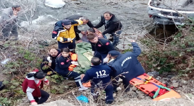 Dereye düşen otomobil vinç yardımıyla çıkartılırken, yaralıların durumlarının iyi olduğu öğrenildi.