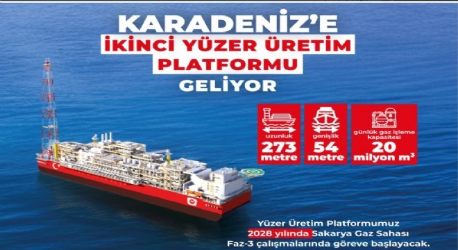 Enerji ve Tabii Kaynaklar Bakanlığı tarafından Karadeniz’deki Sakarya Gaz Sahası Geliştirme Çalışmalarını Faz-3 aşamasına taşıyacak önemli bir adım atıldı. Karadeniz’deki üretime destek verecek olan gemi formunda yeni bir Yüzer Üretim Platformunun (FPU) temini için Çin menşeli bir firma ile anlaşmaya varıldı. Mühendislik, tedarik, imalat, kurulum ve devreye alma faaliyetlerini kapsayan sözleşme kapsamında, Çin’de platformun üretimine başlandı.