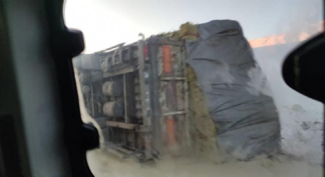 Bayburt-Erzurum karayolu güzergahı, Kop Dağı mevkiinde trafik kazası meydana geldi, saman yüklü kamyon bir anda yükün ağırlığıyla yalpalayarak, devrildi.