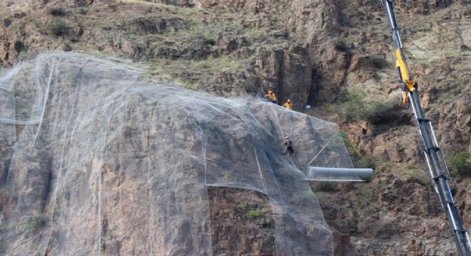 Erzurum’u Karadeniz’e bağlayan Olur-Artvin yolunda güvenlik tedbiri amacıyla kayalıklar çelik telle kaplanıyor.