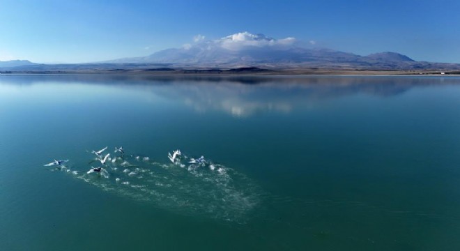 Yaz aylarında gölü pembe tonlara bürüyen flamingoların göç etmesiyle bölgede hâkimiyet beyaz renkli ötücü kuğulara geçti. Yaklaşık 200 farklı kuş türüne ev sahipliği yapan Arin Gölü, havaların soğumasıyla birlikte önemli bir göç durağı olarak yeniden canlandı. Bu dönemde göle gelen ötücü kuğular, sakin ve etkileyici duruşlarıyla izleyenleri adeta büyülerken, dronla çekilen görüntüler doğanın sunduğu eşsiz güzelliği gözler önüne serdi. Havadan kaydedilen görüntülerde, Arin Gölü’nün berrak yüzeyinde süzülen kuğuların arka planında yükselen, zirvesi karla kaplı Süphan Dağı dikkat çekti. Kuğular ile dağın görkemi aynı karede buluşunca ortaya kartpostallık manzaralar çıktı.