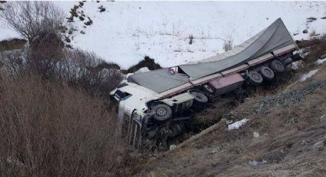 Aşkale ilçesinde meydana gelen trafik kazasında tır şarampole devrildi.