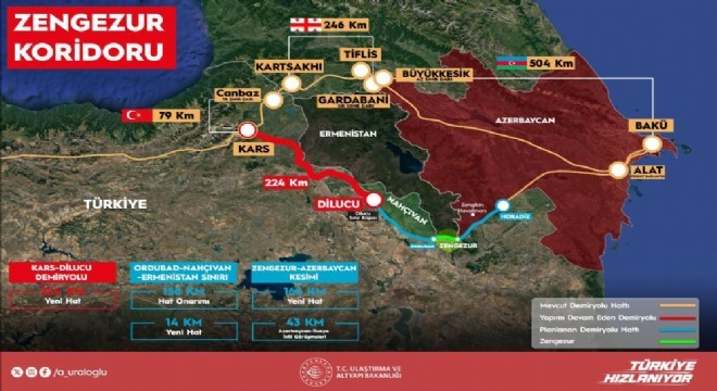 Ulaştırma ve Altyapı Bakanı Abdulkadir Uraloğlu, Türkiye’nin, Avrasya'nın lojistik kalbindeki yerini sağlamlaştıracak Kars-Iğdır-Aralık-Dilucu Demiryolu Hattı’nın temelinin 22 Ağustos Cuma günü atılacağını açıkladı. Hattın Zengezur Koridoru’nun asli parçalarından biri olacağını vurgulayan Bakan Uraloğlu, “Daha önce 2,4 milyar Euro dış kredi sağladığımız hat, ülkemize de döviz girdisi sağlayacak. Kars-Iğdır-Aralık-Dilucu Demiryolu Hattı’nın tamamı ise yaklaşık 110 milyar lira yatırım bedeliyle inşa edilecek.”