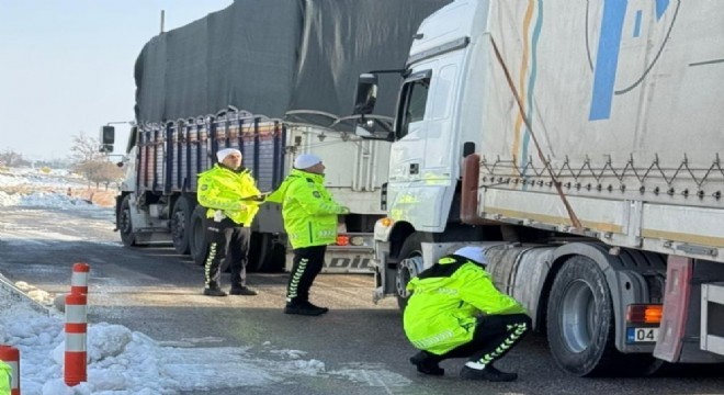 Erzincan İl Emniyet Müdürlüğü Bölge Trafik Denetleme Şube Müdürlüğü personelince zorunlu kış lastiği uygulamasının başlamasıyla birlikte Erzincan’da şehirlerarası yük ve yolcu taşıyan ticari araçlar tek tek kontrol edildi.