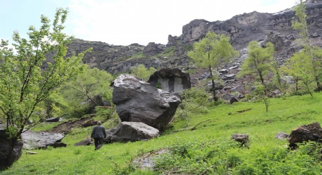 Narman ilçesine bağlı Alabalık Mahallesi'nin bir kilometre aşağısında kuzey denilen mevkiden yağışların ardından kopan dev kayalar 100 dönüme yakın bahçeyi kullanılmaz hale getirdi.