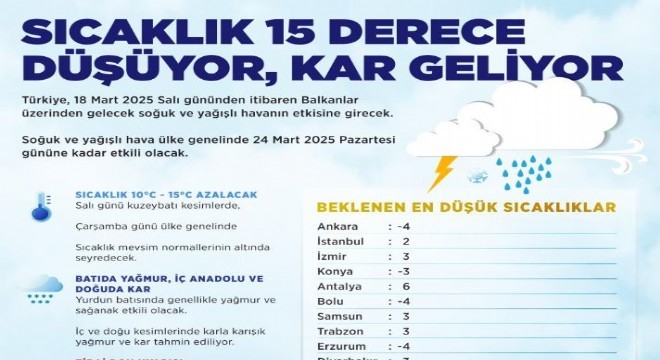 Çevre, Şehircilik ve İklim Değişikliği Bakanlığı’na bağlı Meteoroloji Genel Müdürlüğü’nün değerlendirmelerine göre, Türkiye 18 Mart Salı gününden itibaren Balkanlar üzerinden gelecek soğuk ve yağışlı havanın etkisine girecek. Hava sıcaklıkları salı günü kuzeybatı kesimlerinde, çarşamba günü ise ülke genelinde 10 ila 15 derece azalarak, mevsim normallerinin altına düşecek.